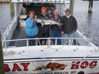 This 39 pound rockfish was caught on November 24th and put us in 2nd place in the MSSA Fall Rockfish Tournament 2013!  Pictured are: Cathy, Dan, Captain George of Tyler's Tackle Shop, and Phillip.