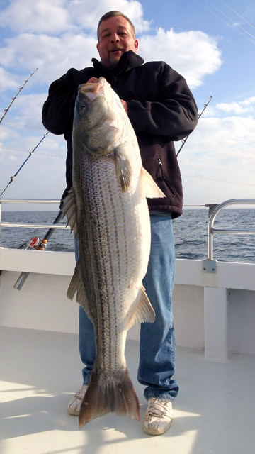 Bob Critcher (shown above) was fishing aboard the Wound Tight early in December when he caught this behemoth Striped Bass that was 52" long and weighed in at a whopping 54.65 lbs.