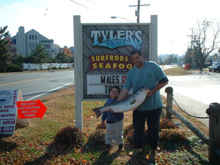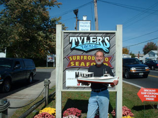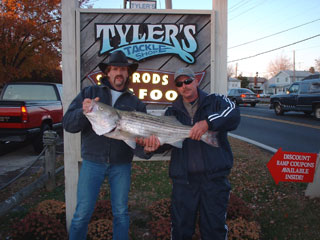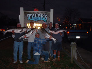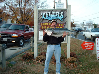 Captain Bob Frye of the Fins, with Leroy Wilkerson (32.5 lb., 43"), Dale Frye (mate), Dean Frye (25 lb., 40"), Scott Krug (20 lb., 39"), Jeff Turco (32 lb., 43") and their catch on November 30, last day of Maryland's rockfish season. Joseph and Robert Sniezek and Ryan and Lonnie Johnson with their rockfish to 34 inches. Nichole and Lance Julian (Cleveland, OH) and Andrew Julian (Chesapeake Beach) with rockfish over 40 inches, caught November 24. Ryan Wilinski (4 yrs. old) of Capitol Heights with dad Eric and a 25 lb. 44 inch striper. Brandon Smith (7 yrs. old, left) of Westminster (MD) with a 7 lb. 26 inch striper and Greg Leugers (13 yrs. old) of Harpers Ferry (WV) with a 10 lb. 28 inch striper. Stuart Martin of Manassas VA with a 30 lb. 41 inch rockfish, caught aboard the charter boat Mary Lou with Captain Russ Mogul. Brian Smith of Churchton with a 28 lb. 41 inch rockfish, caught aboard the Lady Virginia on November 17. Robert Frye (Sykesville, MD), Marion Carpenter (Marriotsville, MD), Roger Creech (Sykesville), and Dean Frye (Taylorsville, MD) on November 16. Captain Pat Gibson and Joe Acton, both from Deale, and John Betz from North Beach with their catch of stripers to 41 inches. Mike Evans (left) and Vernon Edwards with a 41 inch 23 lb. trophy rockfish, caught November 11 while fishing on the charter boat "Worm". The new owner of a beautiful model work boat.