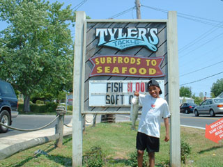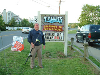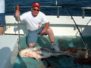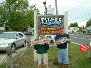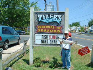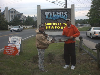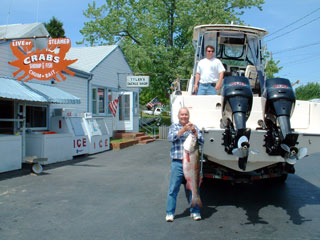 Charles Austin of Tracy's Landing caught this 23 lb. 40 inch rockfish near Buoy 83 during early November, 2002. Here's a 22 inch cobia that was caught July 27 on the Gooses by this lucky angler, who was fishing with Captain Mike Shaffner aboard the charterboat Proud Mary. Jesse Sese with an 8.9 lb. seatrout. The beast was 29 1/2 inches long with a 15 inch girth. Jesse was fishing on the charterboat Proud Mary with Captain Mike Shaffner. Speaking of Captain Mike, here is his crew from June 6 with the winning rockfish, a 29 lb. trophy, in this year's DC Firefighters' Emerald Society Tournament. The crew was from the NIH Fire Department and the winning fish was caught aboard the Proud Mary. The $2400 prize was donated back to the Society for the Children's Hospital Burn Unit. Dwight Rogers, 7 years old, with his first ever rockfish -- 18 1/2 inches long. Here's an 84 pound monster black drum, caught June 1 on the charterboat Worm. Daniel Trang of Fairfax VA checked in the first black drum of the season. The fish, which was 58 1/2 lb. and 51 1/2 in. long, was caught in the Choptank River. What a whopper! Warren Zinck caught this 32 lb. 42 in. whopper on May 16 while trolling a fluorescent red hose along Calvert Cliffs. That's Captain Skip in the cockpit. Phil Kane of Beltsville, MD won a complete trolling rod, reel, line and lure in Tyler's "door prize drawing" during the recent Rod'n'Reel Pro-Am Tournament. Remember next year to stop in and get involved. Tyler Wotson, 10 years old of Monrovia, MD with a 17 lb. stiper. This just might be the largest rockfish we'll see caught in Maryland waters for the whole season, a 47 inch 48 lb. whopper, caught by Captain Tommy Abner on May 2. The monster had a 35 inch girth. Carl Runions of Morefield, WV and Blaine Burrien of Thurmont, MD shown with a 42 inch 26.5 lb. trophy.