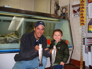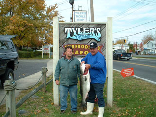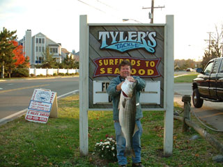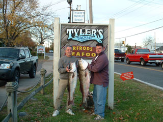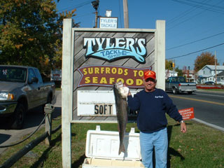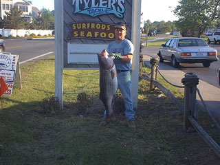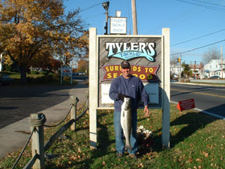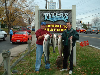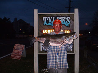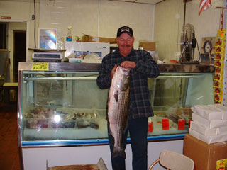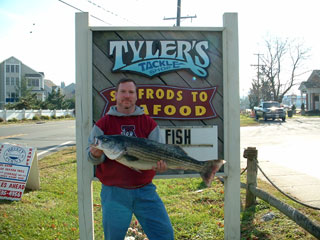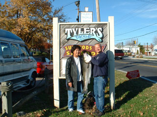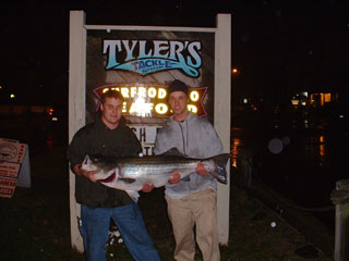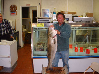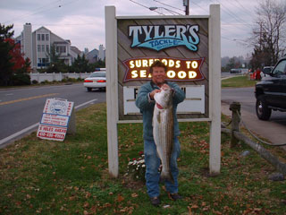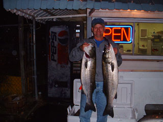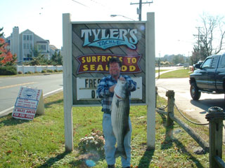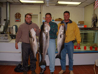 David Dumais of Chesapeake Beach with a 37 1/2" 22 lb. striper caught November 25 on a bucktail. Joe Olenik of Dunkirk with a 40" 26 1/2 lb. striper caught November 25 on a white umbrella rig. Tuna Jim Pike with a 40 1/2" 26 1/2 lb. striper caught November 24 on a white umbrella with a white ruby lip bucktail near Buoy 84 in 90 ft. of water. Andrew Julian, Lance Julian, and Kevin Parker with stripers of 36 1/2 lb., 18 1/2 lb., and 16 1/2 lb. David Isenberg and Captain Mike Johns with a 47" 37 1/2 lb. trophy-sized rockfish they caught on November 21. Paul Golway with a 39" 24 lb. striper caught ona white bucktail/shad combination on November 21. Louie Johnson with a 36" 20 lb. and a 37" 16 lb. rockfish. Joey Peifer and dad Tom with 2 rainbow trout he caught in Hutchins Pond. Ron Schrauder of Annapolis with a 42" 27 lb. striper caught on light tackle with a jighead/bass assassin. Tuna Jim Pike with a 41" 25 lb. striper he caught on a Big Eye Ruby Lip chartreuse parachute in the channel off Bloody Point. Tommy Grenier and Joe Copeland, both of Waldorf, with a 40 1/2 " 26 lb. and a 31 1/2 " 13 lb. rockfish caught November 21 off the Radar Towers on bucktails and parachutes. Captain Tuna Jim Pike with a 36" 21 lb. rockfish caught November 20, 2002. Joe Redzensky with a 37" 21 lb. striper he caught November 20 while fishing with Tuna Jim on the "Moonshine". Captain Tuna Jim Pike with a 41" 27 lb. trophy striper he caught near Bloody Point in 76 ft. of water on a Crippled Alewive behind 24 oz. of weight. Keith and Chris Swann with a beautiful pair of big rockfish, one was 48" long and 40 lb., the other 41" and 26 lb., caught November 18 on chartreuse parachutes. Craig Thomas with a 40" 21 lb. striper he caught off the Silver Ball in 33 ft. of water on a fluorescent red hose on November 15. Captain Lonnie Johnson and wife Shoney with a 40" 24 lb. rockfish caught on a 3 oz. white bucktail off the Radar Towers in 28 ft. of water on November 15 -- Shoney caught the fish... Captain Tuna Jim Pike with a 39" 25 lb. striper caught on the "Moonshine" on November 14 near 84-A on a ruby-lip white parachute behind an umbrella rig. Captain Rich Schott and angler Chris Welsh caught this 42" 25 lb. rockfish on a 19 Tony off the Radar Towers in 80 ft. of water on November 14. Joe Redzensky of Edgewater (MD), fishing with Captain Tuna Jim Pike aboard the "Moonshine" caught this fine rockfish on an umbrella rig with a white ruby lip bucktail off Breezy Point on November 13.