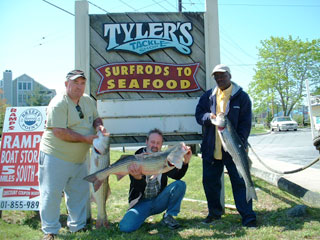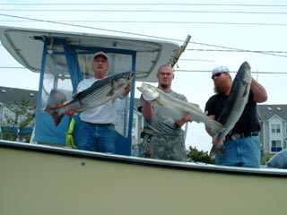 Captain Richard Cassidy, Arthur Thompson, and Gregory Hudgins with stripers from 26 - 33 lb. they caught on April 29. ![]()