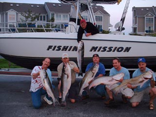 Aboard the "Fishin Mission", Cory McLendon (45" 30 lb.), Johnny Prather (42" 26 lb.), Mike Pendleton (42.5" 24 lb.), Bruce Ewell (41" 25 lb.), Blaine Beyer (40" 19 lb.), and Keven Lucia (36" 15 lb.) stripers. ![]()