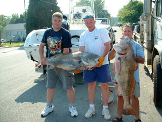 Tom Hoy, Grant Colimer, and Tim Colimer with 70 lb. and 58 lb. black drum. ![]()