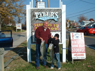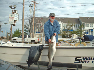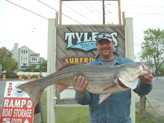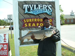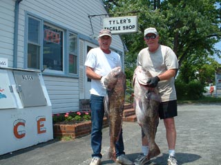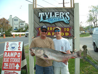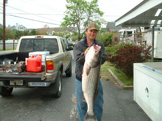 Charlie and son Marcus Wilson shown with a 40 lb. 46" monster rockfish they caught near Parker's Creek on April 29, 2007.