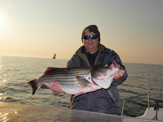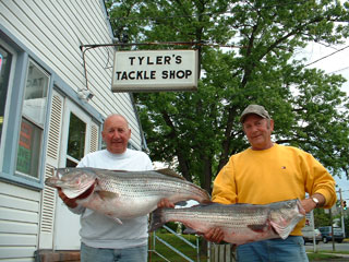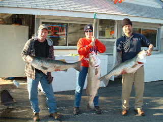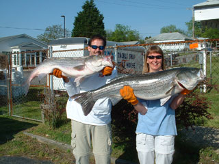 Toni and Steve Quigley of Pasadena shown with 43 lb. 52" and 31 lb. 44" stripers caught May 01. ![]()