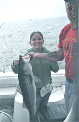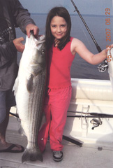 Bill Sands and Paul Weller with 67 and 69 lb. black drum they caught June 1. Devin Watson with a 73 lb. monster black drum. Carroll Bell (left) with a 42.5 lb. 44 1/2 in. rockfish, and Don Bell with an 18 lb. 33 in. rockfish they caught May 17 on umbrella rigs. Lauren, age 7 from St. Mary's, witha 44" monster rockfish. Kaitlyn, age 11 and also from St. Mary's, with a 34 " trophy striper. Kenny McMichael with a 31 lb. 43" trophy rockfish caught May 05. ![]()