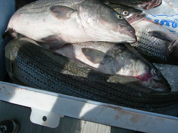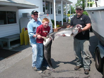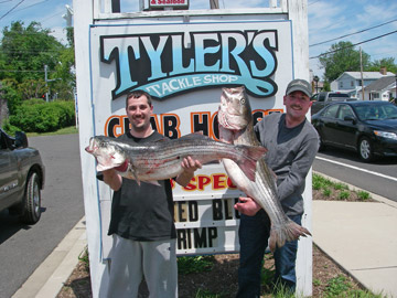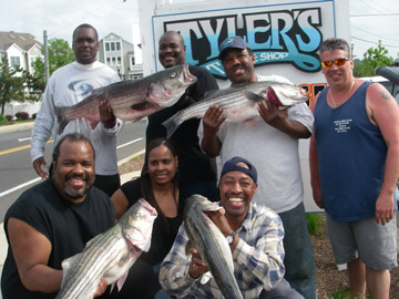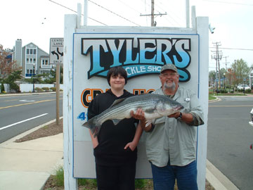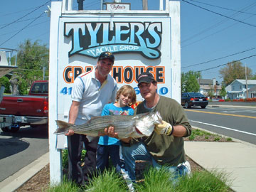 (Courtesy Roch Mongeon, Tyler's regular)Melissa's first catch with her new "birthday present" fishing rod... Cathy King, Stuart King, Phillip King, William Windsor, Chris Windsor, Nathan Windsor, and Captain Georgie Klein of Tyler's Tackle with a great catch of rockfish up to 38 lb. and 47 inches! Even a blind squirrel find a few nuts once in a while... Keith Keel Sr., Phillp Keel and Keith Jr. with a 22 lb. 38 inch rockfish they caught May 8...
