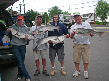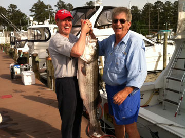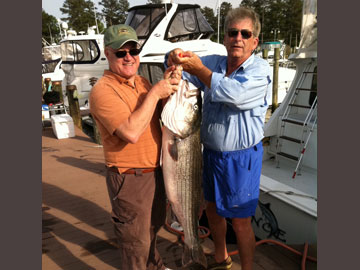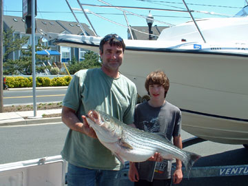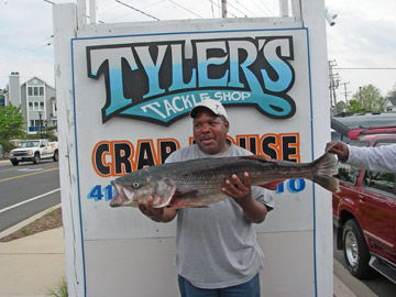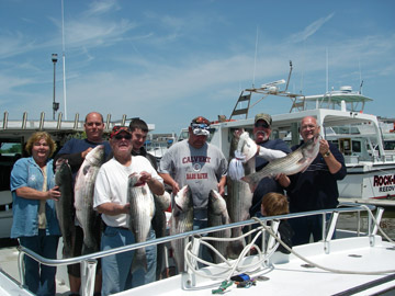 Steven Landreth, Randy Landreth, Jeff Johnson and Patricia Claridge with rockfish up to 42 inches they caught near Parker's Creek in 38-40 ft. of water. Jeremy Reinhardt with a 20 lb. 38 inch rockfish and Paul Reinhardt with a 30 lb. 43 inch rockfish. John Glover with a 38lb. rockfish... Lisa Glover, Glenn Glover, Joe Tarise, George Yates, Charles McRae, and Thomas Edwards and Andre Edwards with the biggest rockfish ... Andre Edwards with a 43 1/2" 28.5lb. big rockfish... Hunter Huxoll (11 years old) with a 32lb. 42 1/2" trophy rockfish and Chris Huxoll with a 28lb. 43" trophy they caught May 02. Tony Brown Sr. with a 46" 34 lb. big rockfish. 48" long 27" girth, caught in 45 ft water directly east of Chesapeake Beach on April 27 with umbrella rig. Angler Gary Holt , 1st Striper ever caught! Net Man, Tim McGrath. Captain of Persistence, 38ft Luhrs Sportfish, John Pinkman. Tackle and advice from Tylers!! Here's Christopher (9 years young) and dad Christopher Cravath with Donald Richitt and a great 43.5" 29.5lb. trophy rockfish they caught aboard the private boat "Hunter" on April 25. Here's Anthony and Zachary Towney with a super 42" 28.5lb. monster rockfish they caught April 24. Here's Noah and Brighton Plauger with a beautiful 39" 19.5lb. trophy rockfish they caught April 18. Here's Noelle Paolicelli with a beautiful 36" 17lb. Striper she caught Opening Day.