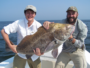 Capt George and his crew would like to thank Capt. Russ Mogel aboard the Mary Lou Too for his assistance in helping us find the Rockfish.That's Daniel and Andrew Mongeon of Beltsville, MD holding up Andrew's Black Drum (we estimate around 60#) just before it was released. It was about 7 am and very quiet on the water except for the boys' cheering and the drumming of that magnificient, homely fish.
