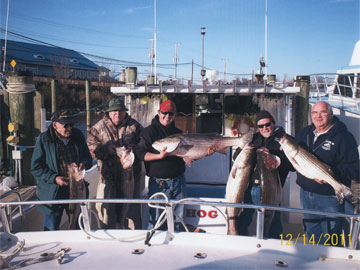 Left to right, here's "Papa Huff", Captain Jim Wilson from Dunkirk, Tyler Huff (grandson), Steve Huff (son), and Georgie Klein, owner of Tyler's Tackle Shop. Patrick Mason reeled in this rockfish on December 2nd. Weight was 36 lbs. It was 46" long and had a girth of 25".