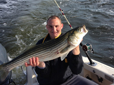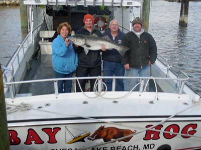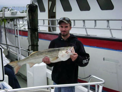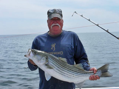 Family Day on the Bay. These fish were caught on May 8th straight out from Chesapeake Beach (western edge) in 48-60' of water. Chris Windsor caught this nice rock using Tyler's Blue Headed Chugger