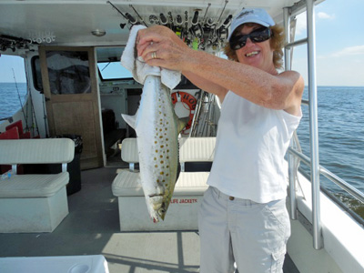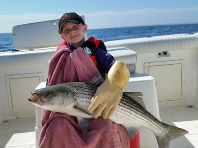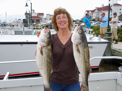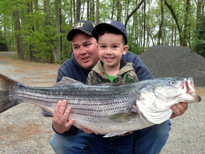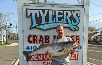 Here's Tony Brown of Damascus MD with a 47 inch 38.5 lb monster Rockfish caught in 60 ft of water on a white Tyler's chute.
