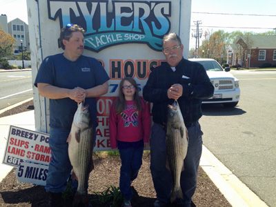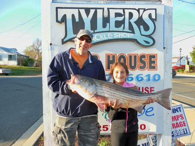 Captain George took a bunch of Boy Scouts from Troop 53 out on the Bay July 13... For more photos of the trip, click here . Noah, Zack and Brighton had a good day catching this 40" rockfish on April 30. Lincoln, Chad and Hannah Zirk caught their 40", 23lb rockfish on Sunday April 30th Billy Coleman with this 38" rockfish caught on the Bayhog on April 20th! Ann & Capt George with this 40" rockfish Ann caught on April 20th First day of Rock Season. Pictured are Scott Withee Sr., Scott Withee, Jr. and Allison Withee. Fish were 36" and 38"
